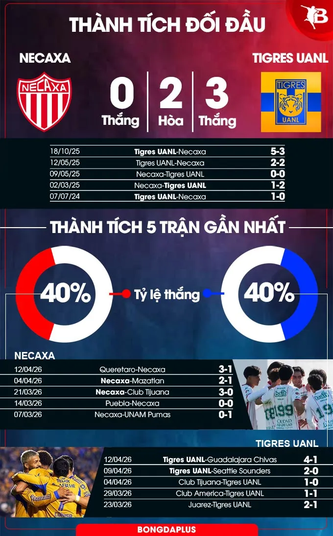 Xét về phong độ, cả hai đội đều có 2 chiến thắng trong 5 trận gần nhất. Tuy nhiên, lợi thế sân nhà của Necaxa là điểm sáng khi họ đã thắng 6/10 trận sân nhà gần đây. Ngược lại, Tigres UANL lại tỏ ra khá chật vật khi làm khách, với chỉ 1 chiến thắng trong 8 lần ra sân gần nhất. Đây là yếu tố quan trọng hứa hẹn mang về 3 điểm cho đội chủ nhà.