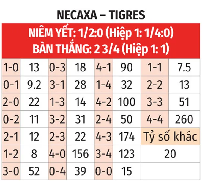 - Tổng số bàn thắng lẻ: Lịch sử đối đầu nghiêng về kịch bản tổng bàn thắng lẻ, với 5/8 lần gặp gần đây. Xu hướng này cũng được củng cố bởi phong độ của Necaxa (8/10 trận sân nhà gần nhất có tổng bàn lẻ) và Tigres (8/10 trận sân khách gần nhất).