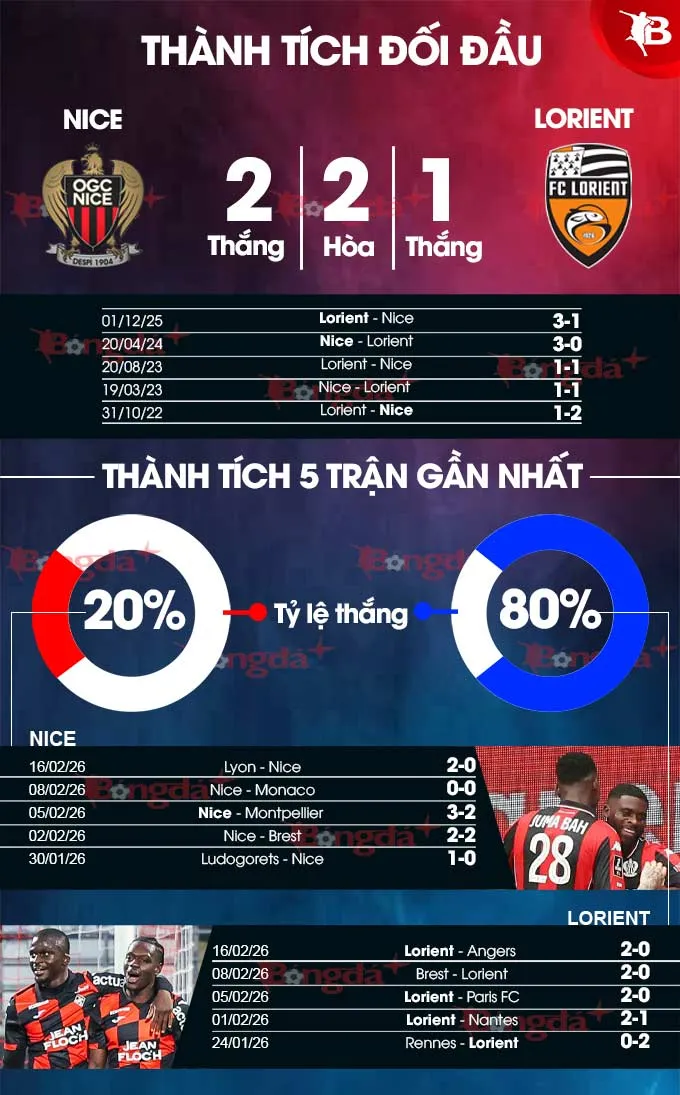 Lịch sử đối đầu cũng nghiêng về phía Lorient. Họ chỉ thua Nice 1 lần trong 4 lần chạm trán gần nhất, và ở lượt đi mùa này đã có chiến thắng thuyết phục 3-1 ngay trên sân nhà của đối thủ.