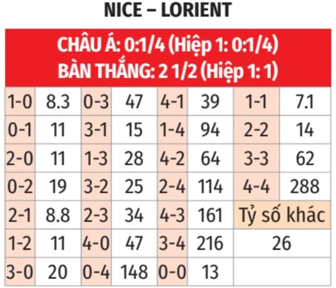 Với hàng thủ yếu của Nice và phong độ ổn định của Lorient, một trận hòa là kịch bản có tỷ lệ cao. Hiệp một được dự báo sẽ có nhiều tình huống nguy hiểm và phạt góc.
