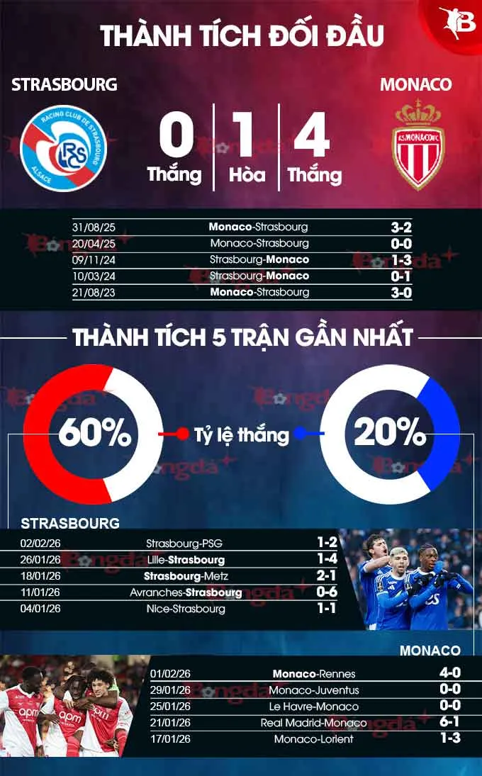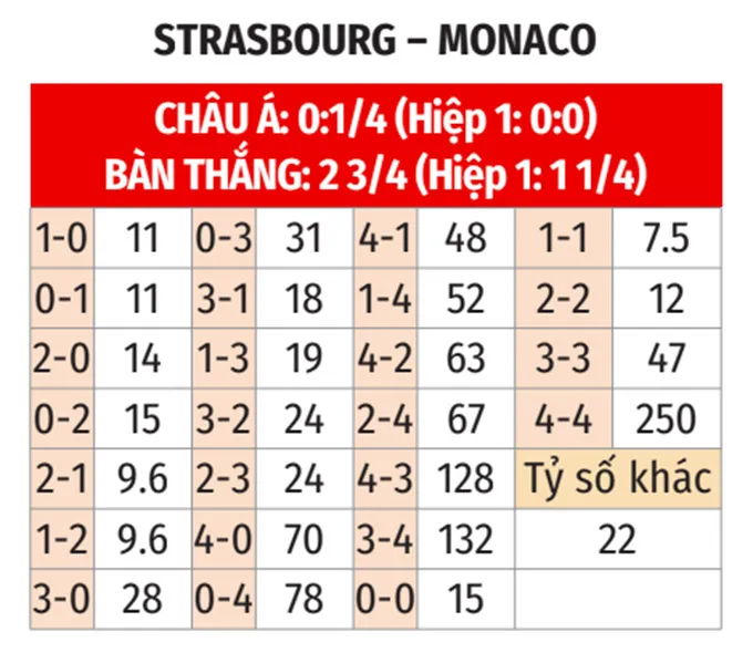 - Cả hai đội cùng ghi bàn (Both Teams to Score - BTTS): Khả năng cao xảy ra. 6/7 trận gần đây của Strasbourg và 5/8 trận vừa qua của Monaco đều chứng kiến cả hai bên cùng có bàn thắng. Hàng thủ không chắc chắn của cả hai được thể hiện qua việc 6/7 trận của Strasbourg và 9/12 chuyến làm khách gần nhất của Monaco đều không giữ sạch lưới.